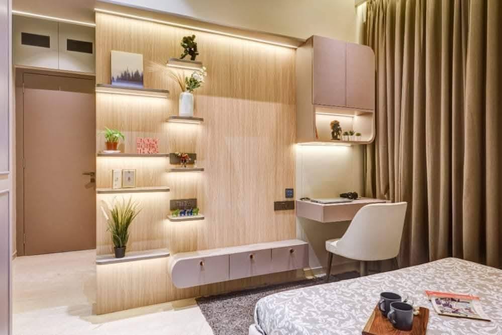 The living room is the heart of this 2 BHK home. Designed with a clean layout and comfortable seating, it creates a welcoming space for family time and entertaining guests. Thoughtful lighting and subtle design elements add warmth, making the living room both stylish and inviting.