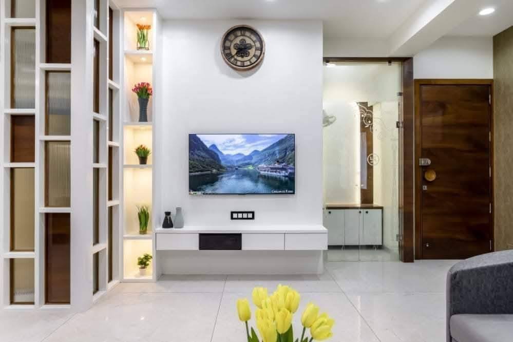 The TV unit is designed to enhance the living room while offering practical storage. With a clean and modern finish, it keeps the space organized and visually balanced. The design complements the overall interiors and adds a stylish focal point to the room.